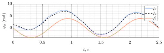 In this section, we demonstrate the performance of the proposed observer on a quadruped robot moving in the sagittal plane. Following [46], we represent it as a five-link structure. This allows us to describe the robot’s position with seven generalized coordinates: the position and orientation of the robot’s trunk and its four joint angles. The flat model pairs up the legs—the configuration of both front legs is described by the same two coordinates; the same is true about both rear legs. We denote as and angles associated with the joints connecting the front and rear legs, respectively, and and are angles in the knee joints in the front and rear legs. Parameters of the robot used in the simulation are shown in Table 3.