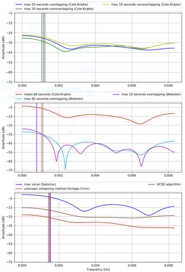 All of the presented algorithms, except Sadeh’s (1989) [] algorithm, can be interpreted as low-pass filters. Cutoff frequencies are very similar in all cases and correspond to periods from 10 to 25 min. Treating the central step of these algorithms as FIR filters should allow making better use of the signal processing theory, as there are well-established and optimized packages for filter usage and design. Furthermore, constructing similar algorithms in the style analogous to the Cole-Kripke algorithm family should be trivial and quick, while maintaining the assumption that the signal filtered with a low-pass filter should indicate sleep below some threshold and wake above it (or vice versa).