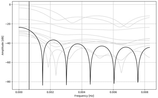 Transmittance of the FIR filter representing Sadeh 1994 linear terms of the equation (black), compared to the transmittances of the other algorithms discussed in this study (grey), the same as Figure 1. Cutoff frequency: 0.00065 Hz (period: 25 min 40 s).