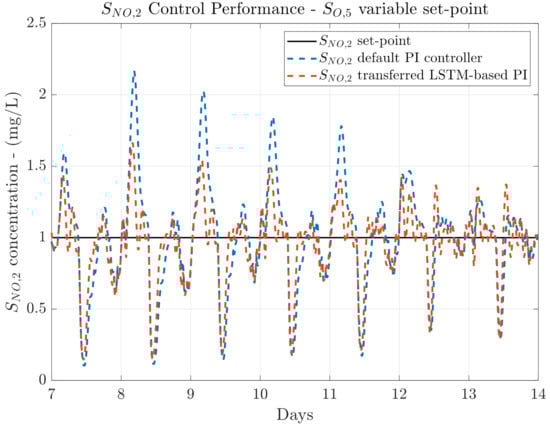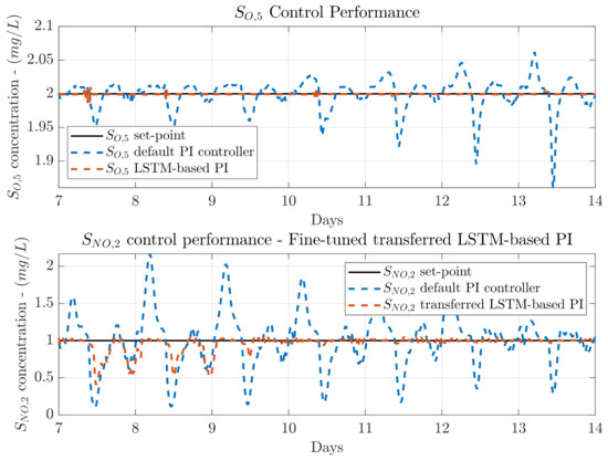 - LSTM-based controller Fine-tuning & TransferThis transfer approach is the most important one since it corresponds to the transfer method performing a fine-tuning process and therefore, adapting the behaviour of the transferred controller to the target domain dynamics. In other words, in this transfer learning approach the LSTM-based controller yielding the best control performance between the Transfer Learning from DO to NO and the Transfer Learning from NO to DO will be considered as the candidate to be fine-tuned. Results in Section 4 show that the best control performance is offered by the DO LSTM-based PI. For that reason, this is the LSTM-based controller considered in the fine-tuning process. Nevertheless, this choice can be done at the very beginning if the performance offered by the conventional PI structures is considered (see Figure 4).In terms of the three TL classes, the LSTM-based controller Fine-tuning and Transfer approach consists in an inductive transfer learning task: data from the source domain, the DO control loop, is considered to firstly obtain the DO LSTM-based PI structure. Then it is fine-tuned (retrained) with data coming from the PI controlling the target domain, the NO control loop. In other words, the default controller whose performance is observed in Figure 4a has been considered to perform the fine-tuning process of the DO LSTM-based PI controller. Thus, the obtained controller, the fine-tuned DO LSTM-based PI (FTDO LSTM-based PI) will know how to correctly manage the desired variable, but adapted to the NO control loop. This clearly shows that an existing controller managing the target control loop is compulsory to obtain the measurements considered in the fine-tuning process. This differs from traditional and conventional TL applications, where labelled data are available.The main point here is that in the fine-tuning process not all the layers of the DO LSTM-based PI controller will be retrained with measurements of the target domain: the weights of the two LSTM cells are blocked whilst the weights and biases of the two feedforward layers (see Figure 5) are modified in the fine-tuning process. The LSTM cells are the ones that are blocked since they are the layers gathering the information about the time-dependence between measurements. The feedforward layers mainly take this information to adapt the output of the controller to the desired control loop. For that reason, these are the layers which will be retrained just to adapt the outcomes of the LSTM layers to the new domain.The measurements of the target domain are again obtained by performing a whole-year simulation of the BSM1 behaviour when the three weather profiles, dry, rainy, and stormy, are randomly distributed. The weights and biases of the two retrained feedforward layers are obtained considering the same training parameters as in the case of the DO LSTM-based PI training process: initial learning rate equals to , the weight decay equals to and the early patience is set to 5 epochs.