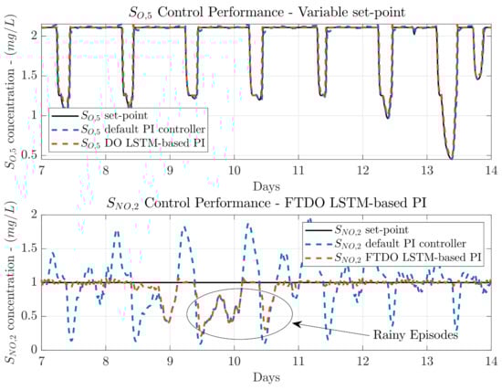 - Transfer Learning from NO to DOThe NO LSTM-based PI structure is directly transferred from the NO to the DO control loop without performing any change, neither in its structure, nor in its weights and biases. Thus, the knowledge on how to manage concentration is transferred into the DO control loop. The unique change performed in this transfer approach corresponds to the normalisation and denormalisation stages. They have been adapted to normalise and denormalise the measurements coming from the NO control loop instead of the DO control loop. Following this, the NO LSTM-based PI will be at least equal to the default PI managing the concentration, that is, the NO control loop PI. If Figure 4 is taken into account, one can assure that the NO LSTM-based PI controller will not offer such a good control performance as the DO LSTM-based PI derived from the DO control loop.
