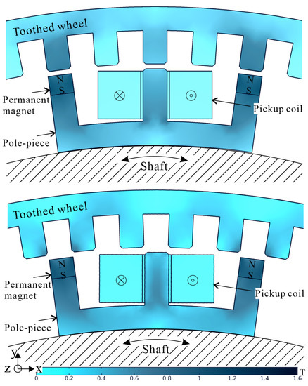 21]. In a VREH, both the magnet and the pickup coil are stationary, whereas the reluctance variation, and thus the changes in magnetic flux, are a result of the relative motion between a ferromagnetic structure and the pickup unit.