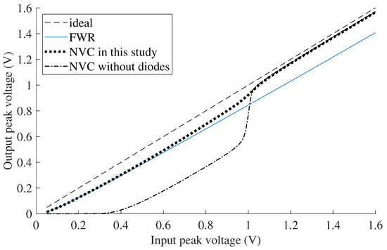 ), the NVC performs similarly to the FWR, but its performance increases rapidly with increasing rotational speed, outperforming the VD at the highest input conditions. This difference can be explained based on the characteristics of the MOSFETs in the NVC circuit. At a low rotational speed, even with the parallel connected Schottky diodes, the input voltage is far below the voltages required for the switching of the transistors, effectively converting the NVC into an FWR (see