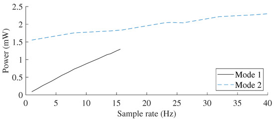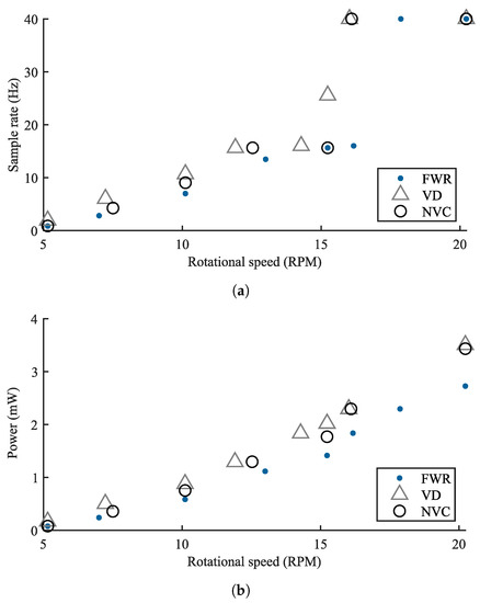Figure 15 shows the obtained output power levels and achieved sample rates of the wireless RPM sensor under different operational speeds and with the respective rectifier implementations. In accordance with the results presented in