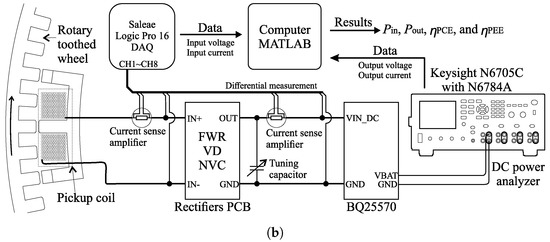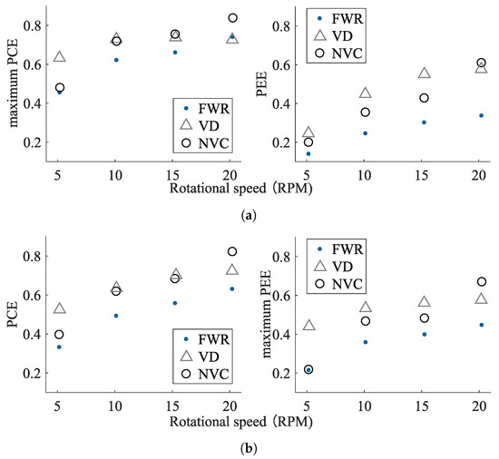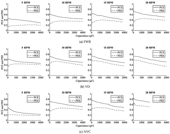 Figure 14b shows those for an PEE-optimized capacitance. It can be observed that a higher rotational speed increases PCE and PEE. This is due to the higher output voltages and currents obtained from the transducer at higher rotational speeds, which improves conversion efficiencies. Moreover, the results show that the capacitance should be tuned for a maximized PEE value, as a higher PEE is equivalent to a higher output power.