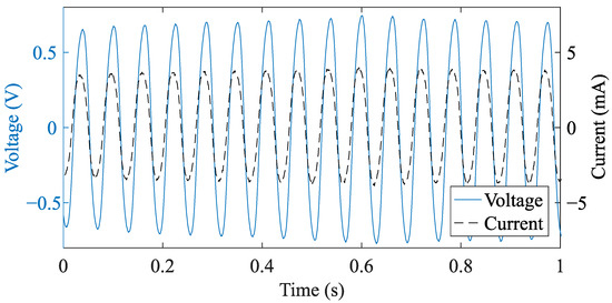 Figure 12 illustrates an example output of the current and voltage measurement for the case of a rotational speed of approximately 10 rpm (≈1.06 rad s