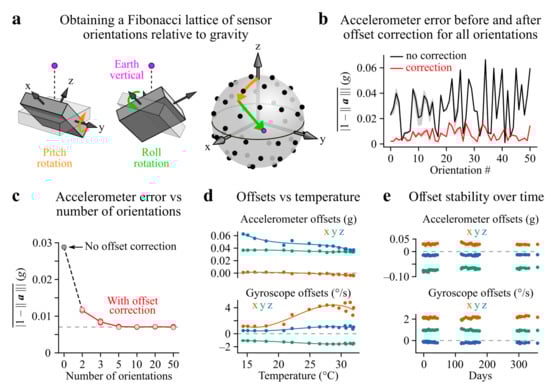 Sensor offset calibration. (a) A two-axis (pitch and roll) motorized rotation stage was used to orient the line of gravity (purple dot) along a series of 50 homogeneously distributed directions (black dots) in the sensor’s reference frame (see Section 2.5). The orange and green arrows on the right represent the trajectory of the gravity line during consecutive pitch and roll rotations. (b) Absolute acceleration error (, where is the acceleration vector) during immobility for all tested orientations, with or without offset correction (data from one example sensor, repetitions of the test). Shaded areas represent the 5–95th percentile range. (c) Average absolute error in the norm of measured acceleration as a function of the number of orientations (N) used to compute the offsets (data from one example sensor). Red points represent the values obtained with 10 repetitions of the test, with red lines connecting their average values. For , a subset of the 50 orientations was selected to best match a homogeneous distribution on the sphere for N points; for and , the set of orientations was selected to be the one corresponding to the mode of the error distribution computed using all possible combinations of N points, which for corresponded to orthogonal point configurations. (d) Effect of the temperature on acceleration and gyroscope offsets for one example sensor. The lines represent cubic polynomial regressions. (e) Stability of gyroscope and accelerometer offsets for one example sensor over a year.