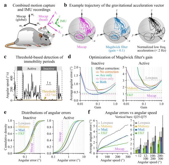 Orientation relative to gravity (i.e., attitude, here referred to as tilt) is classically calculated from 6-axis IMU data using Kalman filters or a family of less computationally demanding algorithms designated as complementary filters. Because their performance likely depends on movement statistics, we wished to compare these different types of filters in our actual recording conditions, i.e., using head inertial data collected from freely moving rats. To assess the level of precision of an extended Kalman filter (EKF) and of two complementary filters (Madgwick and Mahony) [43,44], we used concurrent 3D video motion capture as a ground-truth measurement of head tilt (see Figure 2a and Section 2.6). Figure 2b shows an example trajectory of the actual (motion capture-based) and estimated (IMU-based filter output) gravitational acceleration vector in the head reference frame. Because gravitational acceleration tends to concentrate in the low frequency range of the total acceleration signal [9], we also plotted the trajectory of normalized low-pass filtered (<) acceleration. Notably, the actual and estimated trajectories were similar while low frequency acceleration significantly deviated from them in a region visited during belly grooming (dashed ellipse in Figure 2b), a behavior associated with rapid head movements. To assess the performance of head tilt estimation in the presence or absence of movements, we split the data in periods of activity (movement, total duration = 25 ) vs. inactivity (immobility, total duration = 11 ) by angular speed thresholding (Figure 2c and Figure A3; see Section 2.9). Head tilt estimation errors were calculated as the point-to-point angular distance between the trajectories of gravitational acceleration vectors, taking motion capture data as a reference (see Section 2.6.6). The parameters of IMU filters were then optimized to minimize this error (see Section 2.6.7).
