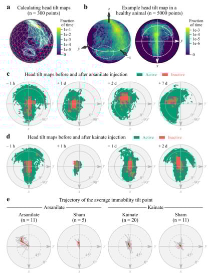 Head tilt estimation in rodents still largely relies on observational methods [26,29,30,31,32]. Compared to these approaches, IMUs can provide a comprehensive and quantitative description of head tilt both in static and dynamic conditions. To capture the natural dynamics of head tilt during free behavior, we constructed “head tilt maps” by first triangulating the unit sphere in the IMU reference frame and then counting the number of times gravity was aligned within each triangle (Figure 3a and Section 2.7). Such maps provide a snapshot of the various tilt orientations explored by the animal, with certain areas of the sphere associated with specific behaviors such as grooming and rearing [9]. For visualization purposes, spherical head tilt maps were 2D projected (Figure 3b) and binarized. Differences between treatments were clearly visible on these maps: a strong deviation of the gravitational acceleration vector away from the lesion side (indicating a tilt toward the lesion side) with a moderate reduction of head mobility (the area of the sphere visited by the vector) in the arsanilate group, and a moderate deviation coupled to a strong reduction of head mobility in the kainate group (Figure 3c,d). To obtain a simpler metric of head tilt, we fitted a von Mises–Fisher distribution onto each spherical head tilt map computed during immobility and took its mean direction as an estimation of the average tilt point, i.e., the average direction of the gravitational acceleration vector (see Section 2.8). The trajectories of this average tilt point across all available time points show that arsanilate-treated animals indeed developed a tilt toward the lesion side coupled with a slight downward pitch (Figure 3e).