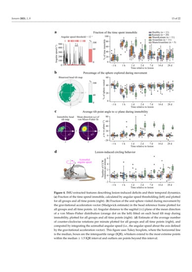 IMU-extracted features describing lesion-induced deficits and their temporal dynamics. (a) Fraction of the time spend immobile, calculated by angular speed thresholding (left) and plotted for all groups and all time points (right). (b) Fraction of the unit sphere visited during movement by the gravitational acceleration vector (Madgwick estimate) in the head reference frame plotted for all groups and all time points. (c) Angular distance to the sagittal () plane of the mean direction of a von Mises–Fisher distribution (orange dot on the left) fitted on each head tilt map during immobility, plotted for all groups and all time points (right). (d) Estimate of the average number of counter-clockwise rotations per minute plotted for all groups and all time points (right), and computed by integrating the azimuthal angular speed (i.e., the angular speed about the axis defined by the gravitational acceleration vector). This figure uses Tukey boxplots, where the horizontal line is the median, boxes are the interquartile range (IQR), whiskers extend to the most extreme points within the median ± 1.5 IQR interval and outliers are points beyond this interval.