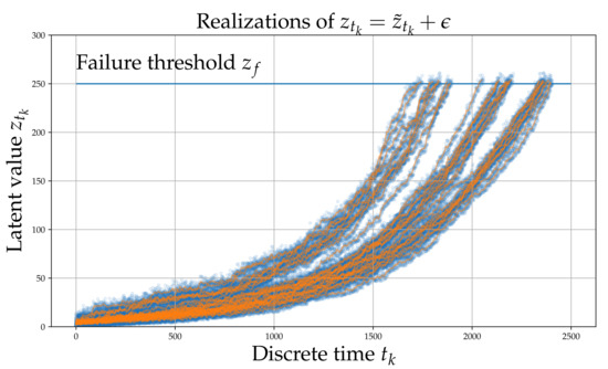 The purpose of generating such a controlled dataset is to verify the efficacy of the approach on a case study where the ground truth is known. The underlying process governing the degradation is assumed to follow a non-stationary Markov process with Gamma distributed increments [44]. This is of course not an exclusive assumption; further models have been shown to be suited for the simulating the RUL problem, including nonlinear Wiener Process models [45]. The parameters of the Gamma distributions producing the increments, which correspond to the deterioration of condition, are assumed to depend on the previous steps, as required by the physics of the deterioration phenomenon. In physical terms, this simulates the path dependence of irreversible processes. The random process presented herein does not have a direct physical analog and is only designed to demonstrate the ingredients of the proposed algorithm and verify its performance. The process generating the latent space is defined as follows