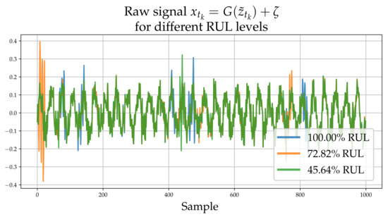 Raw high-frequency time series realizations corresponding to , and for RUL. The process adds high frequency “spikes” of random magnitude which depend on .