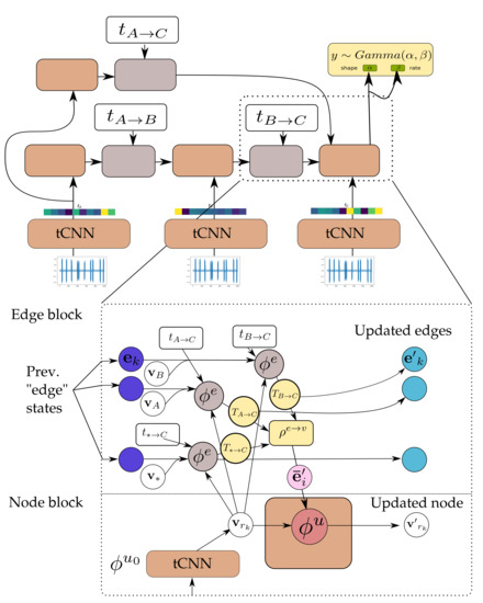The variable dependencies of the proposed model are depicted in Figure 5 for three observations. The computational architecture is depicted in detail in Figure 6. The variable represents the current estimate for the latent state of the system. This corresponds to the node states V. The variable , which represents the propagated latent state from past observations, depends on the latent state , an exogenous input that controls the propagation of state to and potentially other propagated latent state estimates from instants before . The variable corresponds to an updated edge state and the exogenous inputs can be the edge state before the edge step E. The exogenous input to the state propagation function can be as simple as the elapsed time between two time instants, i.e., or encode more complex inductive biases, such as the values representing different operating conditions during the interval between observations. An arbitrary number of past states can be propagated from past observations and aggregated in order to yield better estimates for a latent state . In addition to propagated latent states, instantaneous observations of raw data inform the latent state . For instance, in Figure 5, depends on but at the same time on and potentially more propagated states from past observations (other yellow nodes in the graph) and at the same time to an instantaneous observation . Each inferred latent state can be transformed to a distribution for the quantity of interest . The value of the propagated state variable from state s to state d, , depends jointly on the edge attributes and on the latent state of the source node. In a conventional RNN model, corresponds to an exogenous input for the RNN cell. In contrast to an RNN model, in this work the dependence of the estimate of each state depends on multiple states by introducing a propagated state that is modulated by the exogenous input. In this manner, an arbitrary and variable number of past states can be used directly for refining the estimate of the current latent state, instead of the estimate summarized in the latent cell state of the RNN. In the proposed model, the parameters of the functions relating the variables of the model are learned directly from the data and essentially define the inductive biases following naturally from the temporal ordering of the observations. This approach allows for uniform treatment of all observations from the past and allows for the consideration of an arbitrary number of such observations to yield an estimate of current latent state.