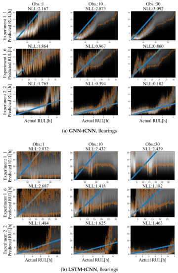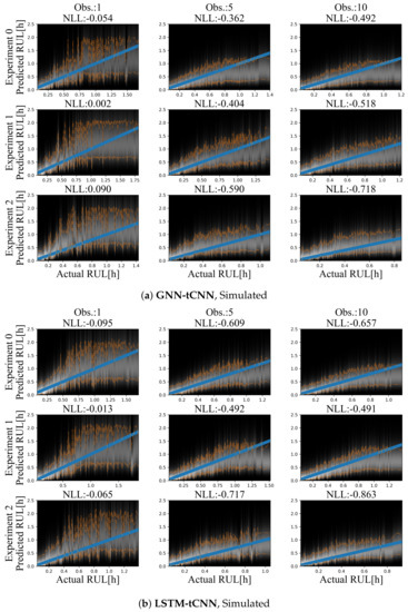 Although it is easy to create a large number of training and test set experiments from the simulated dataset, in order to keep the simulated use-case realistic and equivalent to the bearing experiment, only 12 experiments were used for training and a set of three experiments was used as the test set. Representative prediction results for the test-set experiments are shown in Figure 9a for the GNN-tCNN and Figure 9b for the Long Short-Term Memory network with CNN feature extractor (LSTM-tCNN). The accuracy of the model is inspected in terms of the expected negative log likelihood (smaller is better). When more observations are used, the estimates for the RUL of the fictitious processes are more accurate for a larger portion of the observations, for both models. When a single observation is used, which completely neglects the long-term evolution of damage, but uses short-term features that are extracted by the learned graph-independent (which corresponds to a temporal CNN), the RUL estimates for both methods are inaccurate and fluctuate at the beginning of the experiment (top-left side of Figure 9a,b). Moreover, the estimated probability distributions of the RUL are narrower when approaching failure. This observation aligns with the intuition that it is not possible to have sharp estimates at initiation of the experiments.