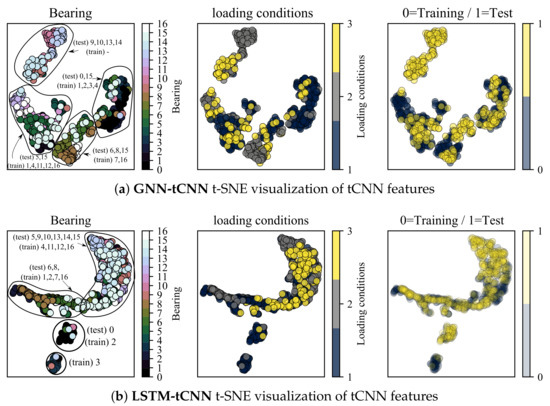 In this section, the t-distributed Stochastic Neighborhood Embedding (t-SNE) dimensionality reduction technique [54] is employed to inspect the properties of feature representations of both the trained GNN-tCNN and LSTM-tCNN networks on the bearings dataset. The intermediate layer used for inspection is the output of the global pooling of the convolutional input block. The analysis is focused on features close to failure. Ideally, we want the feature representations for similar conditions of loading and degradation to lie close to each other. The t-SNE technique provides a low-dimensional representation (typically of dimension 2 or 3) of a set of higher-dimensional vectors, given some measure of similarity between these vectors. As shown in Figure 11a, discernible clusters of data are formed. These clusters correspond to experiments that produce similar sets of features for the subsequent processing with the causal GNN or LSTM. As shown in the left-most plot, embeddings from the same experiment form clusters, which is something to be expected. However, it is also observed that a number of experiments form together super-clusters, which hints to similar signals and therefore similar degradation modes for these experiments. Interestingly, the different loading conditions do not form these super-clusters in the t-SNE space, which hints to commonalities due to other underlying factors. It is possible that discrete clusters correspond to different failure modes, yet this cannot be confirmed since the failure modes of the bearings are not reported for this dataset. Interestingly the t-SNE representations of features that correspond to readings from the test-set overlap with the corresponding representations from the training set as shown in the right-most plot. This result supports the hypothesis that the tCNN features learned during the GNN-tCNN training indeed generalize well to the test-set. Furthermore, note that the clusters containing points from the experiments and (9,10,13,14) for the GNN-tCNN embedding does not have training data but only testing data (top left). When we do not have corresponding representations in the testing set, as it is the case for this cluster, the network is not expected to perform well. Indeed the performance for these experiments is bad for the GNN-tCNN network. Indeed, as reported in Table 5, these are 4 out of the 5 experiments in the test-set that the GNN-tCNN underperforms.