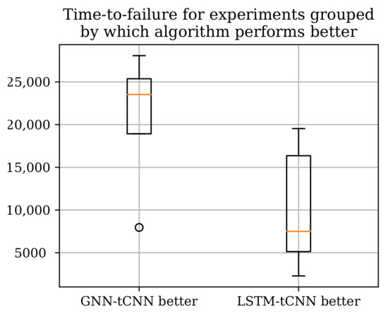 The total experiment times grouped by which RUL method performs better according to the MAE metric. The GNN-tCNN performs better for longer experiments.