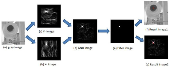 Figure 3. Convolution image, (a) is gray image. (b) is X-image. X-image is the grayscale image convoluted with circle_x. (c) is Y-image. Y-image is the grayscale image convoluted with circle_y. (d) is the AND image. The AND image is obtained by operating the AND operation between the X-image and Y-image. (e) is the filter image. The filter image is obtained by threshold and eroding and dilatinge the AND image. Lastly, we draw the detected center (red circle) of the bobbin in (f,g).