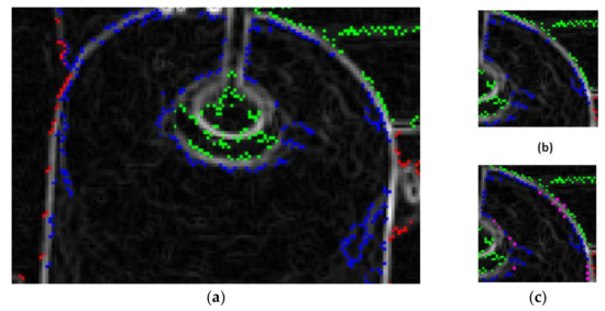 We extract contours from every sub-image by findContours [14] (a function in OpenCV). One detected contour is stored in different point sets. However, there are two problems here. The first one is that the contour points are dense in the zigzag place, but sparse in the smooth place, and the smooth place is just the edge of the bobbin and thread roll. Therefore, it is necessary to insert points at the sparse place. The other one is that one thread roll or bobbin’s edge points may not be in one points set, but distributed in two or more points sets. At the same time, all points in one set may detected from two or more different objects, as shown in Figure 6a. Therefore, before fitting an ellipse [18,19,20,21], it is necessary to segment and merge each points set.
