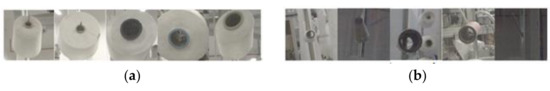 Model one is a two-classification model; the samples include positive and negative samples [32,33], and the size is 200 × 200 × 1 pixels. The positive samples are sub-images in which the thread roll’s margin is not zero, as shown in Figure 8a, and it should cover all cases as much as possible. Negative samples are mainly images in which the thread roll’s margin is zero, and some background images, as shown in Figure 8b. Here, there are about 1000 positive samples, 1300 negative samples, and 200 valid samples. We use an image enhancement algorithm to extend the samples [32,33]. Then, the image is converted into a grayscale image, and finally normalized as the model one’s input. Typical positive and negative samples are shown in Figure 8.