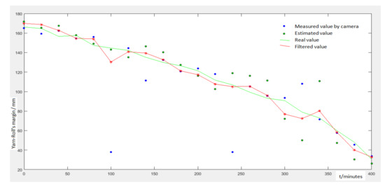 In order to verify the precision of results fused by Kalman Filter, we designed the following experiment: We put 30 thread rolls on supports, and the robot patrols and captures an image every 20 min. Then, we use the image to calculate each thread roll’s margin. Figure 14 shows the measured value and estimated value of one thread roll in different time. Then, we fuse the estimated value and measured value by Equations (19)–(24). We analyze all statistics and conclude the following results: