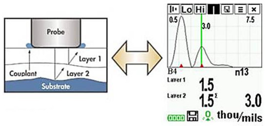 A probe that could generate and detect ultrasonic vibrations could determine thickness measurements of coatings. It is possible that, with sufficient calibration, the determination could be made between different coating layers, as shown in Figure 4 [32]. It is important, however, to note that as these layers are decreased in thickness limitations in distinguishing layers occur due to noise and that these layers require distinct properties for accurate detection.