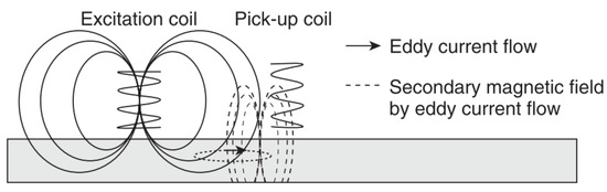 This is a form of electromagnetic testing based on the principle of electromagnetic induction [43,44]. By passing an alternating current through a coil a magnetic field is produced and this in turn produces eddy currents in a sample when placed in close proximity to it; these eddy currents then produce their own magnetic field which opposes the primary field. Defects cause a change in these secondary magnetic fields and hence produce a shift of impedance on the primary coil [45]. These impedance changes or simply changes in the secondary magnetic field are measured [45,46]. Hence, changes in conductivity and permeability are measured and these can be related to corrosion effects [45]. Frequencies between 50 Hz and 1 MHz are commonly used [43] and an example of this principle is shown in Figure 7.