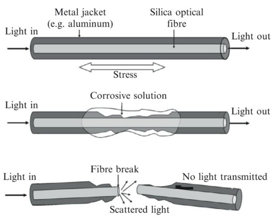 - Wade, S.A.; Wallbrink, C.D.; McAdam, G.; Galea, S.; Hinton, B.R.W.; Jones, R. A fibre optic corrosion fuse sensor using stressed metal-coated optical fibres. Sens. Actuators B Chem. 2008, 131, 602–608. [Google Scholar] [CrossRef]