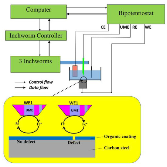 - Xia, D.H.; Wang, J.; Wu, Z.; Qin, Z.; Xu, L.; Hu, W.; Behnamian, Y.; Luo, J.-L. Sensing corrosion within an artificial defect in organic coating using SECM. Sens. Actuators B Chem. 2019, 280, 235–242. [Google Scholar] [CrossRef]