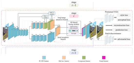 The overall architecture of the proposed inpainting network is schematically illustrated in Figure 1. Let , , and denote the input, output, and groundtruth images, respectively, at the inpainting stage. The shared encoder network captures the useful information from the valid region of . Then, the resulting feature map is fed into the forked-then-fused decoder network for image generation, yielding . Comparing with , we calculate various losses: reconstruction loss, perceptual loss, style loss, and adversarial loss, with the aid of a pre-trained VGG (Visual Geometry Group) network [60] and a patch-based discriminator network [61]. We collectively use these losses to guide the end-to-end training. The inpainting network at the inpainting stage restricts its attention to a limited area of the corrupted region. Its output image acts as the input image for the next inpainting stage, namely that . Without loss of generality, we elaborate on a single inpainting stage hereafter. The subscript t is dropped for clarity, unless explicitly needed to distinguish between multiple inpainting stages.