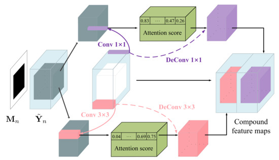 where and represent the patches of centered at in the valid region and centered at in the filled region, respectively. It is worth mentioning that Equation (8) can be effectively implemented using convolution, in which serves as the kernel. We then use the softmax function to exponentiate and normalize the inter-patch similarity along the - dimension. The processed result, denoted by , is called the attention score.