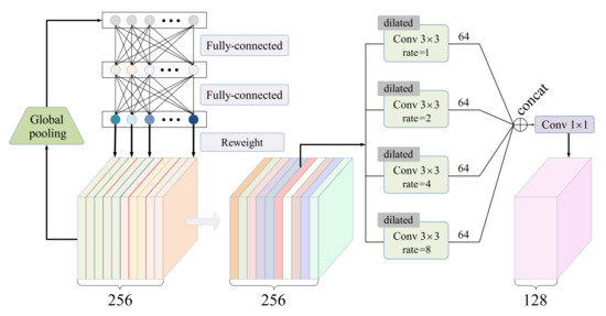 Furthermore, four dilated convolutional layers with the same kernel size of , in parallel, perceive the weighted feature map. Four dilation rates are set to 1, 2, 4, and 8. This ASPP (Atrous Spatial Pyramid Pooling)-like architecture [62] allows us to capture rich features from multi-scale receptive fields. Finally, a standard convolutional layer with a kernel size of is responsible for compressing a feature map by halving the number of channels. The SE-based fusing module outputs a feature map with the size .