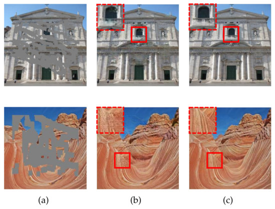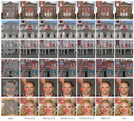 Figure 4 exhibits the qualitative results. The first column of Figure 4 lists the corrupted images, which serve as the inputs to the inpainting networks. From top to bottom, the first two images come from the Place2 [57], the middle two from the Paris StreetView [58], and the last two from the CelebA [59] databases. The irregular gray region indicates the corrupted part, and the corresponding corruption rates are 30.63%, 25.00%, 31.49%, 41.89%, 39.27%, and 38.98%, respectively. The second to seventh columns of Figure 4 display the inpainted results, in which zoomed-in details are placed at the top-left corner.