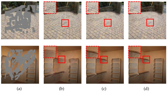 - Criminisi, A.; Pérez, P.; Toyama, K. Region filling and object removal by exemplar-based image inpainting. IEEE Trans. Image Process. 2004, 13, 1200–1212. [Google Scholar] [CrossRef] [PubMed]