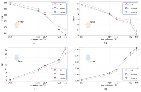 Table 1 lists the quantitative results, in which four canonical metrics, i.e., SSIM (Structural Similarity), PSNR (Peak Signal-to-Noise Ratio), FID (Fréchet Inception Distance) [66], and -norm, are used to objectively evaluate the inpainting quality. In this experiment, we consider three ranges of the corruption rates: 20–, 30–, and 40–, and correspondingly divide the test set into three groups, each of which comprises 150 test images. The values recorded in Table 1 are the average evaluation scores over 150 test images.