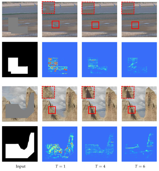 Let and denote the output image of the inpainting network and the groundtruth image, respectively. At the inpainting stage, the resulting image (or the groundtruth image ) is defined as (or ). Furthermore, the inpainted results at the stage will be inherited by the next stage, in the sense that and . The total number of inpainting stages T, which is a hyper-parameter, controls the trade-off between the inpainting quality and the computational cost. We stipulate that the output binary mask is an all one-valued matrix, meaning that the corrupted region must be filled at the final inpainting stage.