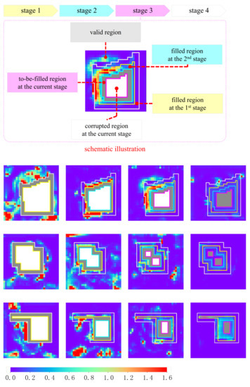 Heat maps of the attention scores. A schematic illustration is shown at the top-half panel, in which four inpainting stages are demarcated by closed-loop frames depicted in colors. Three rows at the bottom-half panel exhibit the heat maps for three practical examples. Four columns, from left to right, correspond to the first, the second, the third and the fourth inpainting stages, respectively.