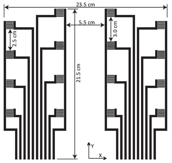 The design of pressure sensing matrix is based on a general sitting area of a wheelchair seat cushion focusing on the ischial areas. The large area screen-printed sensor for wheelchair seat consists of 16 pressure sensing elements, covering an effective sitting area of 505 cm2. The horizontal and vertical dimensions for the sensor matrix are 23.5 cm × 21.5 cm as shown in Figure 1. The distance between sensing elements in sensor matrix is 5.5 cm in X direction, while 3.0 cm for central sensing elements and 2.5 cm for outer sensing elements in Y direction, respectively. These are common seating dimensions of a person with a normal physique for ischial areas. The sensor is usually placed inside or underneath the foam cushion. The assembly requires a very thin and flexible pressure sensor to be able to tolerate mechanical deformations due to user’s movements.