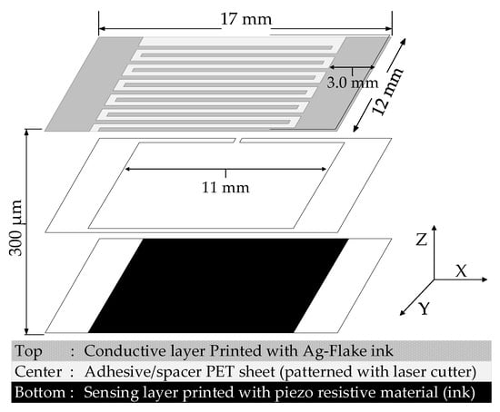 Three PET sheets with a thickness of 100 µm, are employed to construct the proposed large area sensor, described as top, center and bottom sheets for this design. Top sheet is printed with interdigital patterns and interconnects with highly conductive Ag-ink and acts as a conductive layer. Bottom layer is printed with carbon filler based blended ink that has both resistive and piezoresistive properties. The center layer has openings that are patterned by a laser cutter, works as a separator between two layers. The center layer also functions as an adhesive bonding between top and bottom layers. The dimensions and configuration of sensing element are depicted in Figure 2.
