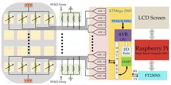 The explicit system model is illustrated in Figure 3 shows the electrical circuitry. The pressure data from sensor matrix are acquired and sampled in the read-out electronics using an 8-bit Atmel ATmega-2560 microcontroller operating at 16 MHz. The microcontroller is programmed using the Arduino software package. When connected in a 5.0 V voltage divider configuration with 10 kΩ resistor, a single sensing element may draw a maximum of 0.56 mA current. The entire read-out circuit utilizes an average current of 100 mA. To get the output voltage (Vout) of each sensor element utilizing a fixed resistor of 10 kΩ with 0.1% precision, the voltage divider configuration is utilized and the output voltage is calculated using Equation (1).