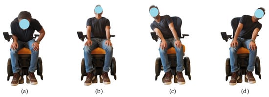 To identify the specific sitting posture on a wheelchair and to label the collected measurements (hereafter referred to as samples) for use in posture classification schemes, we resort to a traditional taxonomy established by physiotherapists and physicians who have the expertise in this field. The following explains the data collecting procedure used in this study: 32 individuals took part in compilation of the dataset and they were instructed to hold each of four postures (a, b, c and d) demonstrated in Figure 5, for up to 30 s (average estimated time required to acquire a reliable sample). The stable values are then selected to make the training data set for four postures, i.e., left-, right-, forward- and backward lean called as class in the data set. Each individual completed one set per posture. Since the data are comprised of 16 sensors, a total of 4096 data points (256 observations × 16 sensors) is obtained. The average weight and weight range of the participants are presented in Table 1.