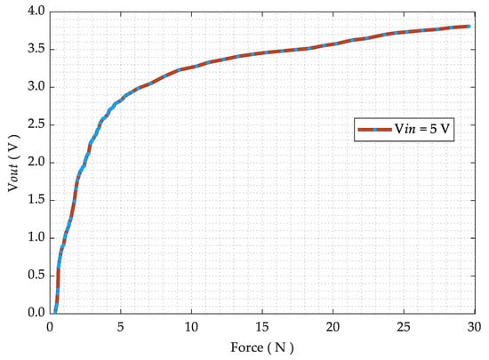 The pressure–voltage relationship is obtained using a 5.0 V voltage divider configuration utilizing a high precision divider resistor of 10 kΩ. Voltage readings are acquired using a digital multimeter (Rhode and Schwarz HMC-8012) and the applied force using a dynamometer (Lutron FG-6020SD) mounted on a manual horizontal translation stage. The acquired voltage–pressure graph is then presented in Figure 7.