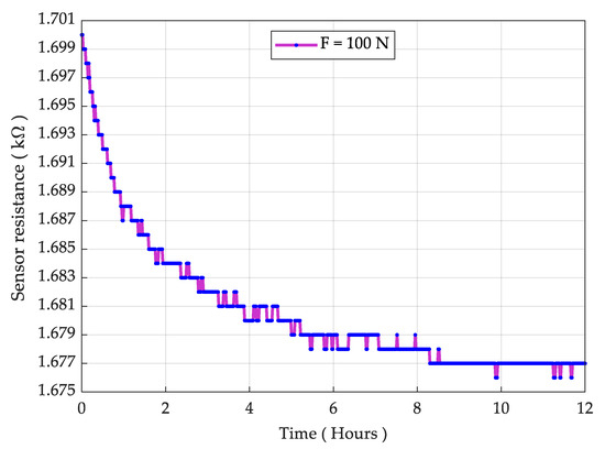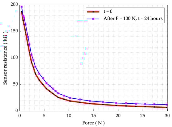 For the durability test, we put a sensing element under 100 N force (about 3.3 times the normal range) for a period of 24 h, utilizing a precision motorized force tester (Mecmesin MultiTest 2.5-dV). The resistance is logged using a UT61D multimeter. The resistance as a function of force is measured once again after the durability test and the result is presented in Figure 8. The result showed a slight increase in the resistance; however, the overall sensing behavior remained nearly unchanged. Then, we considered the sensor for physical and mechanical deformation and it was realized that the sensor PET sheet does not deform physically at 100 N (10 Kg) load. The result for the sensor drift is shown in Figure 9, while the measured drift was 1.41% at 100 N over 24 h. It is also noted that a pressure in excess of 200 N/cm2 causes irreversible damage to the sensor.