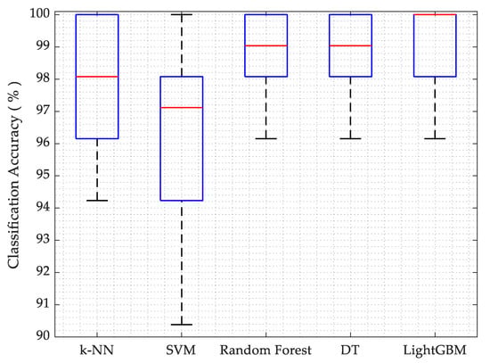 For k-NN, default settings from scikit-learn are used. However, the number of neighbors are set to 3 in our implementation (n_neighbors = 3). It is also noted that the classification accuracy is also similar when (n_neighbors = 5) is used. The k-NN algorithm provided sufficiently better average accuracy for posture classification and less compile time. While using the SVM algorithm, the default settings from scikit-learn are used and (gamma = ‘scale’) is employed. SVM illustrates the worst (least accuracy) among the classifiers due to its binary classification tendency; however, the compile time is sufficiently short. In random forest, default settings from scikit-learn are used that have the required estimators (n_estimators = 100). Random forest yielded very good average classification accuracy: up to 98.65%. Random forest requires high processing resources because of its complexity and takes a longer time to compile, making it not very suitable for use on the raspberry pi 3B. While employing the decision tree algorithm, the default settings from scikit-learn and criterion = ‘gini’ are used. The decision tree also resulted in a better average accuracy and short compile time. For LightGBM, the default settings are used and n_estimators = 100 are already set in the settings. Light GBM performed the best, although it took relatively more compile time than the others; however, it is still faster than the random forest. The average accuracies from the five classifiers are shown as a boxplot in Figure 10.