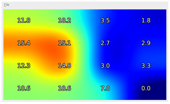 A screenshot of pressure map showing pressure values (in kPa) on proposed embedded system’s screen when seated person leaned to left.