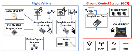 Our experimental flight vehicle, shown in Figure 2, is a multirotor equipped with a gyroscope, accelerometer, and magnetometer. The multirotor used here were introduced in Section IV of [39] and flies an MPU9250 IMU (gyro, accelerometer, magnetometer) and BMP280 barometer. Since the work in [39], a second BeagleBone Blue microprocessor, a PNI RM3100 magnetometer, and a DJI Naza-M V2 GPS unit were added to the vehicle. In addition, the flight controller was changed to the Robotics Cape autopilot (RC Pilot) (RC Pilot was created by StrawsonDesign (https://github.com/StrawsonDesign/rc_pilot, accessed on 19 September 2021)) open-source flight controller.