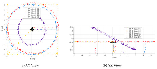 Circular profiles FP-B and FP-C have turning radius 5 m, while FP-D is inclined with respect to the horizontal plane by 30 and has turning radius 3 m. FP-B and FP-C maintain an altitude of 1.5 m, while the inclined circle’s altitude varies from 0.7 m to 3.3 m. The tangential velocity of Profiles B and D are both “slow” at 1 m/s, while Profile C has a commanded tangential velocity of 3 m/s. For all three circular trajectories, the UAV heading is directed to follow a tangent to the circular path.