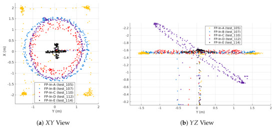 Two trials of each flight profile were conducted with all sensors being sampled at the aforementioned frequencies (Section 4). For the indoor data, we trained the GPR in two different ways. One methodology is to train the GPR using the Scan- lawnmower pattern, and the alternative is to train the GPR using one trial each of the five indoor flight profiles (FP-In-A through FP-In-E), as summarized in Table 3. In both cases, we used both the Scan- trajectory and separate tests of the FP-In flights to validate the map. Below, we use these two methods of training the GPR to analyze which yields more accurate maps (Section 5.1 and Section 5.4). In general, training tests were downsampled to 1 Hz, while validation sets were downsampled to 2 Hz. The one exception is when training with FP-In-A, we downsampled to 2 Hz to provide better coverage along the edges of the planar rectangle. The FP-In-A locations shown in Figure 5 were downsampled to 2 Hz, while all others were at 1 Hz.