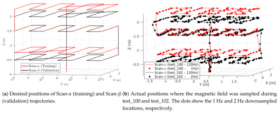 Two additional trajectories (Scan- and Scan-) were flown indoors to train and validate the GPR-based magnetic field map. Both are a lawnmower coverage pattern in the plane at three different altitudes. Scan- (training set) was flown at 0.75 m, 1.5 m, and 2.25 m altitudes, while Scan- (validation set) was flown at 0.5 m, 1.5 m, and 2 m altitudes. The goal was for the validation set to have an altitude that forced the GPR to extrapolate (0.5 m), interpolate (2 m), and match (1.5 m) the training set altitudes. At each altitude, the drone flew a lawnmower pattern in the plane by traversing from −2 m to +2 m in the X direction, then changing the Y position from −1.5 m to +1.5 m in 0.5 m increments. Similar coverage patterns have been used in other magnetic field mapping works [41,42,43]. Figure 6 shows the desired positions and actual flight position Scan- (test_100) and Scan- (test_102) trajectories. In Figure 6b, the lines show the ground truth position of the vehicle at 120 Hz, while the dots are downsamples of the position used to train (downsampled to 1 Hz) and validate (downsampled to 2 Hz) the GPR-based map.