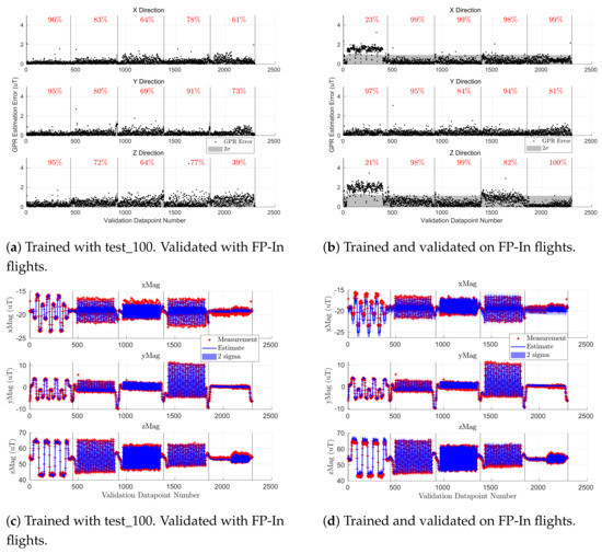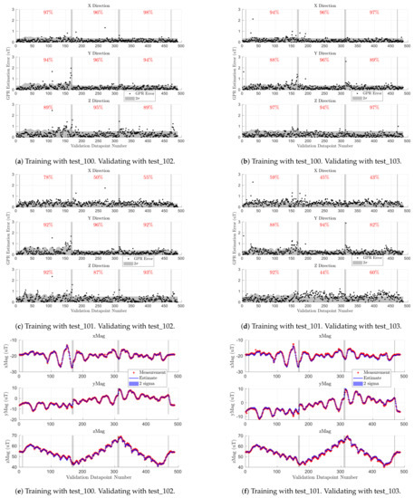 This section analyzes how the locations of the observations used in the training set affected the accuracy of the GPR-based map by comparing the accuracy of a GPR trained on Scan- trajectories against a GPR trained on indoor flight profiles. We show that training on Scan- yielded mean absolute errors of 0.28 T, 0.27 T, 0.48 T, while training on the five indoor flight profiles gave mean absolute errors of 0.30 T, 0.28 T, and 0.48 T for , , and , respectively, when validated on the indoor flight profiles. As such, the outdoor GPR-based map was sufficiently accurate for the analysis conducted in Section 5.3, and the conclusions drawn from Table 4 and Table 5 are sound despite differences in the GPR training methodologies. Note that these metrics exclude validating on FP-In-A due to a sensor misalignment during test_105 (FP-In-A training flight).