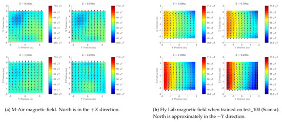 Previous works that generated magnetic field maps can be split into two groups. Some performed simultaneous localization and mapping (SLAM) and were able to construct a magnetic field map as they estimated the pose of their vehicle [12,13,14]. Others first had their robot traverse the workspace to learn the magnetic field and construct a map, then utilized this map in a separate trial to perform state estimation or localization [15,16,17,18,19,20,25]. Our work adopted the philosophy of the latter group by performing a set of training test flights to construct a magnetic field map followed by a separate set of utilization flights meant to assess the accuracy of our attitude estimates by leveraging an existing map. We analyzed the accuracy of our maps by using validation test flights and compared two methods of training a GPR-based magnetic field map.